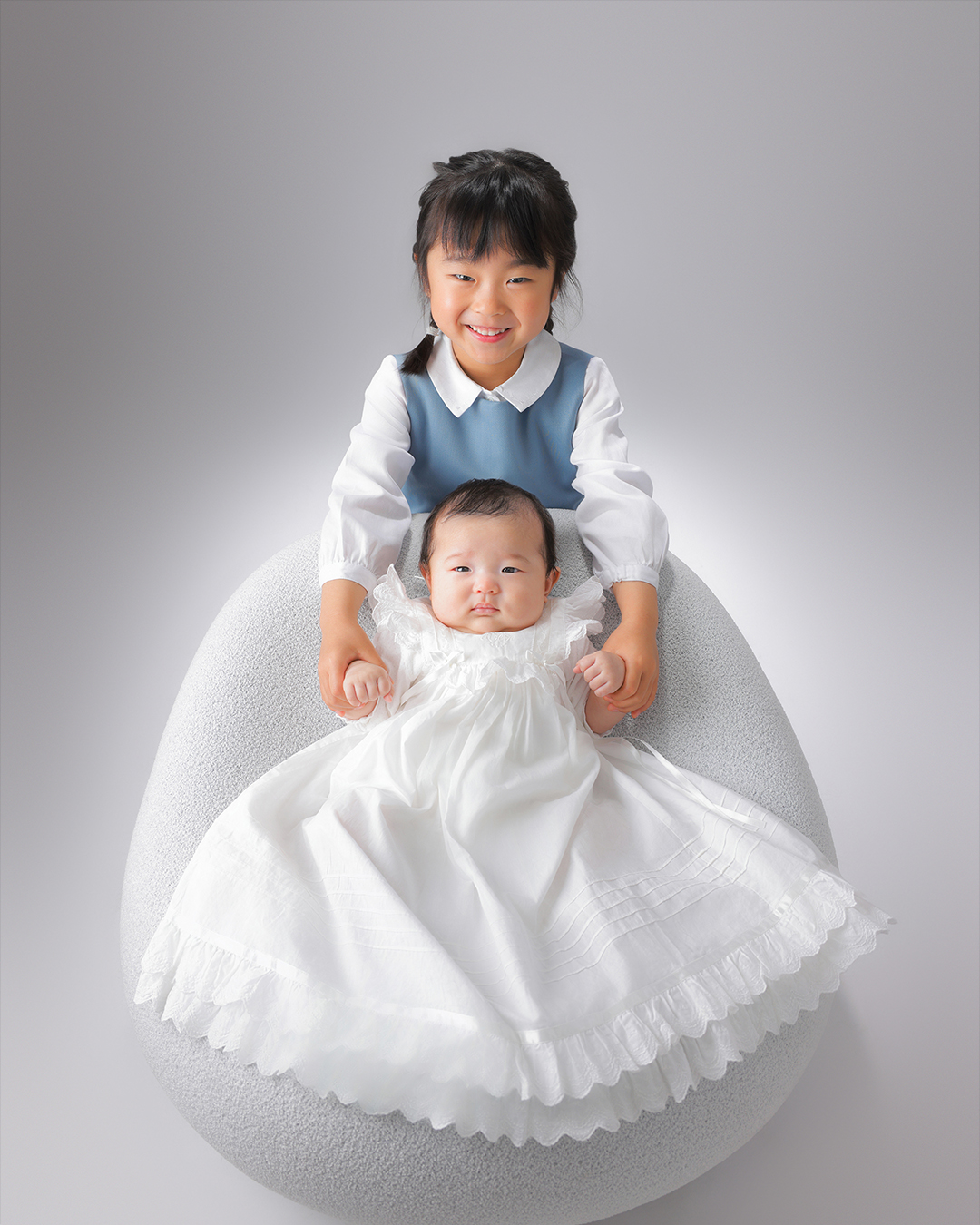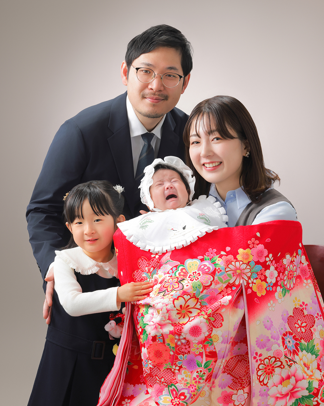 当写真館では、全員の写真と赤ちゃんの写真撮影をご依頼いただいた場合、まず全員のお写真を撮影します。もしお時間の都合で次のご予定に間に合いそうにない場合は、赤ちゃんの撮影は時間や日にちをずらして撮影するといった対応をさせていただいておりますので、どうぞご安心ください。